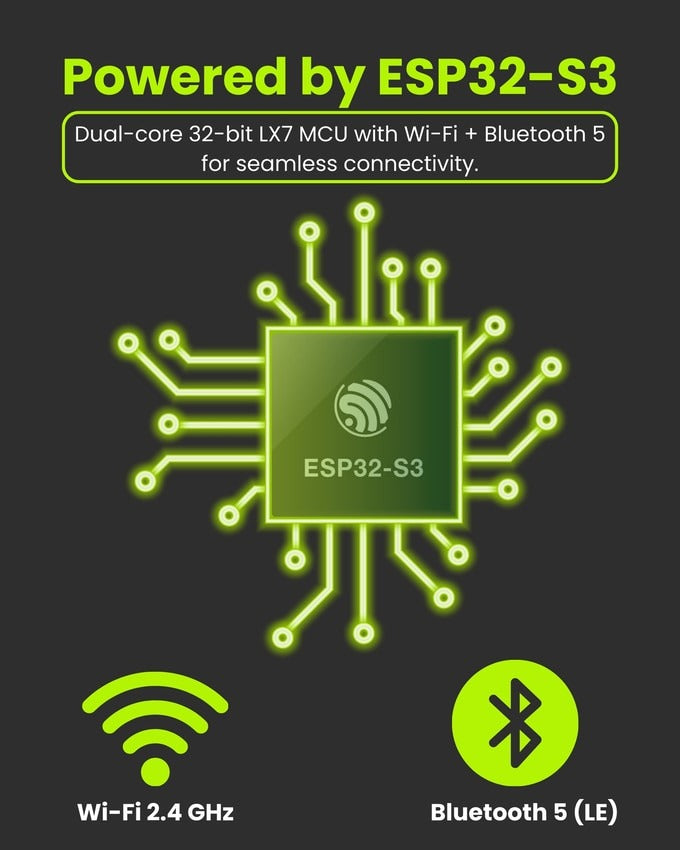 - Powered by ESP32-S3 for Wi-Fi + Bluetooth 5.0