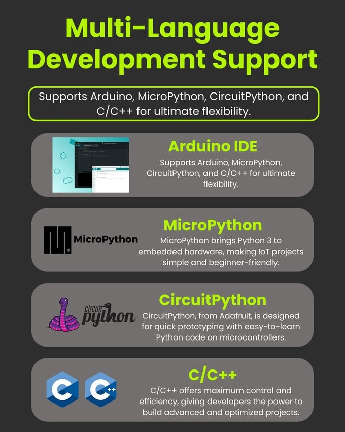 WiFIRCard is designed to be developer-friendly, supporting multiple popular programming environments including Arduino IDE, MicroPython, CircuitPython, and C/C++.