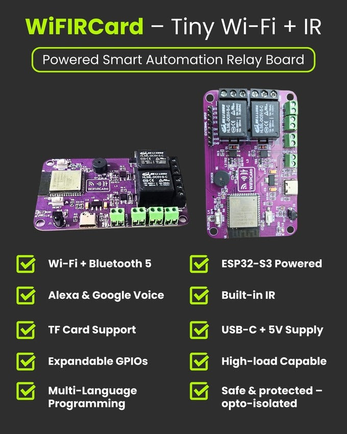 Smaller than a credit card, packed with ESP32-S3, dual relays, Wi-Fi, Bluetooth, and IR control - all-in-one automation card.